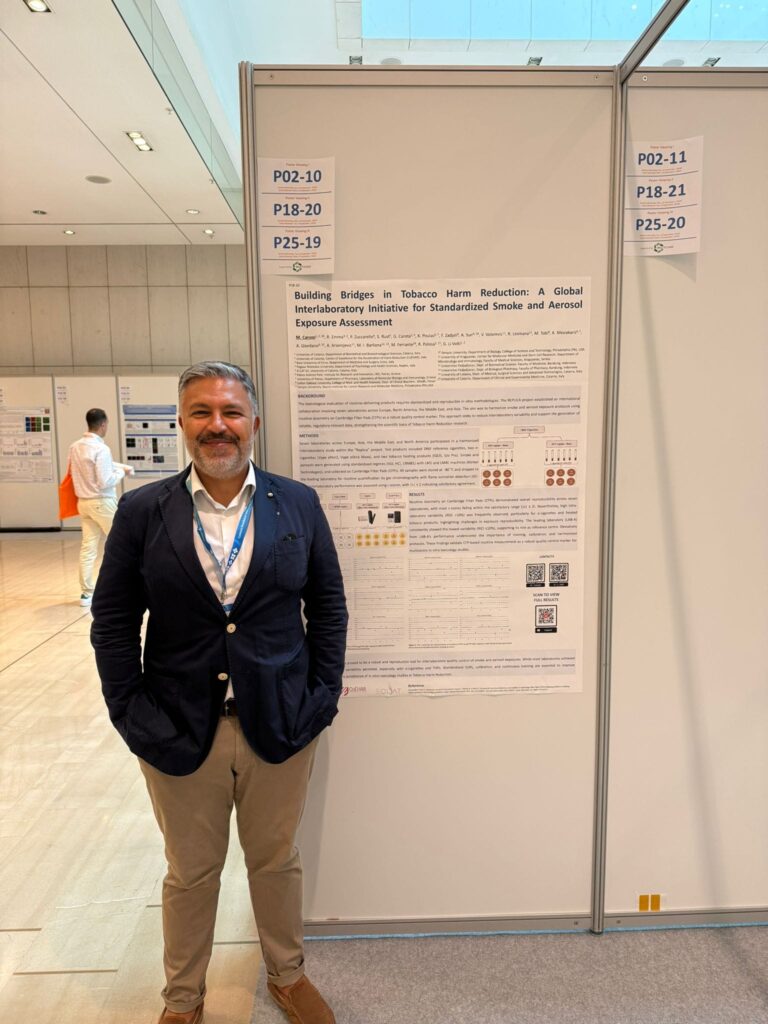Con il lavoro intitolato “Building Bridges in Tobacco Harm Reduction: A Global Interlaboratory Initiative for Standardized Smoke and Aerosol Exposure Assessment”, il prof. Caruso ha spiegato i risultati della collaborazione internazionale che ha coinvolto sette laboratori distribuiti tra Europa, Nord America, Medio Oriente e Asia. Obiettivo: validare protocolli condivisi per la valutazione tossicologica degli aerosol di sigarette elettroniche e prodotti a tabacco riscaldato, introducendo sistemi di nicotine dosimetry come riferimento standardizzato. Questo approccio ha mostrato elevata riproducibilità tra laboratori, rafforzando la credibilità scientifica e regolatoria dei dati.