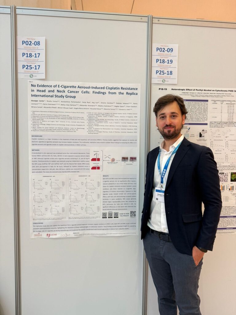 I due ricercatori hanno esposto altrettanti poster scientifici nella sessione dedicata a “In silico and in vitro methods”. Nello specifico, il dott. Carota ha presentato il poster dal titolo: “No Evidence of E-Cigarette Aerosol-Induced Cisplatin Resistance in Head and Neck Cancer Cells”. Si tratta di uno studio multicentrico che ha valutato, con approccio standardizzato in quattro laboratori internazionali, se l’esposizione ad aerosol di sigaretta elettronica potesse indurre resistenza al cisplatino in linee cellulari di carcinoma squamocellulare testa-collo. I risultati hanno mostrato che non vi sono evidenze di aumento della resistenza al chemioterapico a seguito dell’esposizione ad aerosol di e-cigarette, contribuendo a chiarire un tema di grande rilevanza oncologica e clinica.