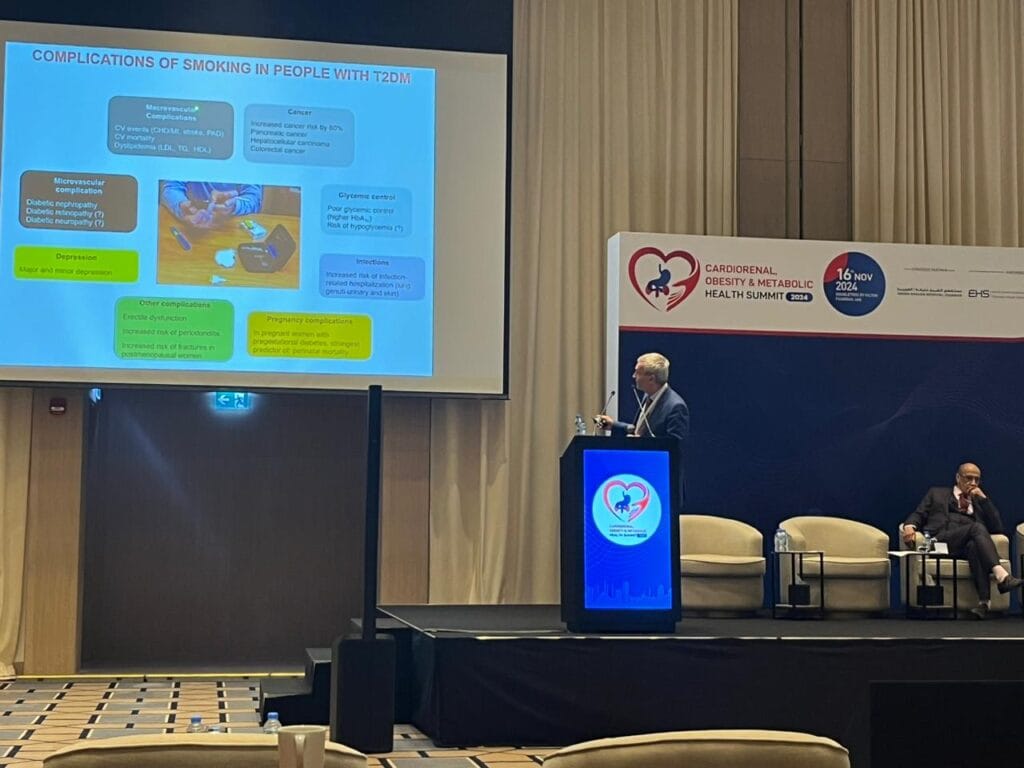 Il 16 novembre, il prof. Riccardo Polosa è intervenuto al convegno “Cardiorenal, Obesity & Metabolic Health Summit 2024” tenutosi a Fujairah, negli Emirati Arabi Uniti, con una presentazione dedicata alle strategie di riduzione del danno nell’ambito dell’approccio di cessazione per il fumatore diabetico.